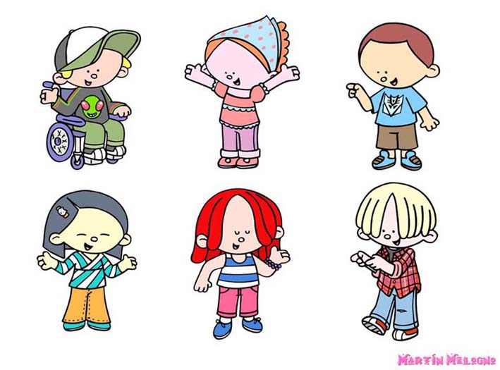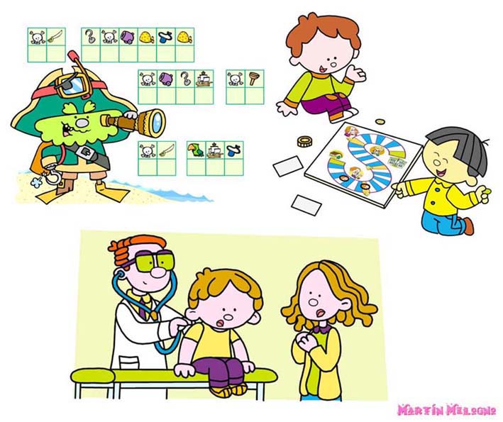 Con este estilo hice muchas dibujitos para chicos de jardín, de preescolar y también para los primeros grados de primaria. Aquí unos nenitos para Puerto de Palos.